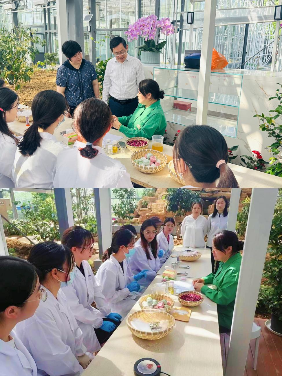 在药用植物园的温室大棚下,国产av 2024届化妆品毕业班同学参加“一路生花”毕业前的一节劳动实践课。国产av 中药药理与中医药学系黄芳教授带领同学们以蔷薇花作为原材料,自制眼影、腮红、香膏、香皂等化妆品。通过在实践活动中融入美育元素,培养中药学生的人文情怀和审美价值,让学生感受中医药文化之美。